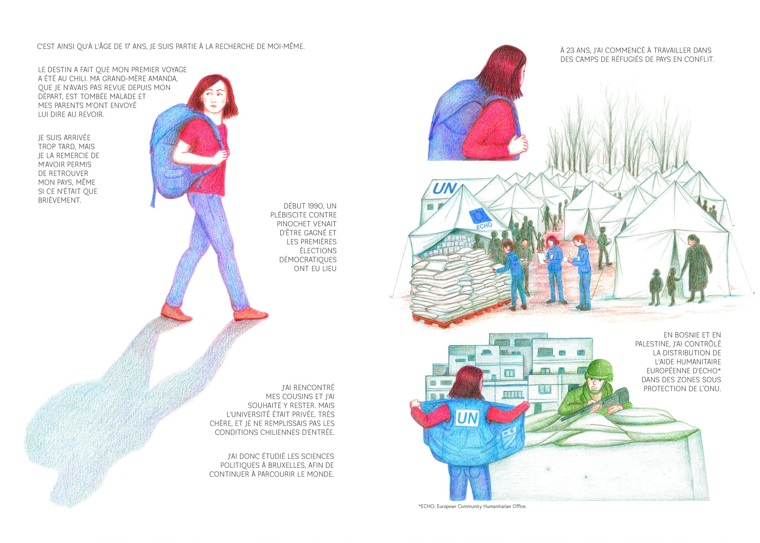 64p : Cette conversation arrive à son terme, je voudrais terminer par une note optimiste, car l’histoire d’Ana se termine aussi par une note très optimiste. Evidemment, sans dévoiler la fin. Sur le Chili, on parle beaucoup de cette partie sombre de l’histoire qui nous donne l’impression qu’il n’y a que deux camps, celui du bien et celui du mal, alors que tout n’est pas noir ou blanc, beaucoup de personnes ont agi dans l’ombre, beaucoup de personnes ont été sauvées grâce à d’autres personnes qui dans l’ombre ont pris des risques… il en est question justement à plusieurs reprises dans ta BD, ces héros de l’ombre qui font aussi partie de notre mémoire et dont on parle rarement. Pourquoi était-ce important d’en parler ?